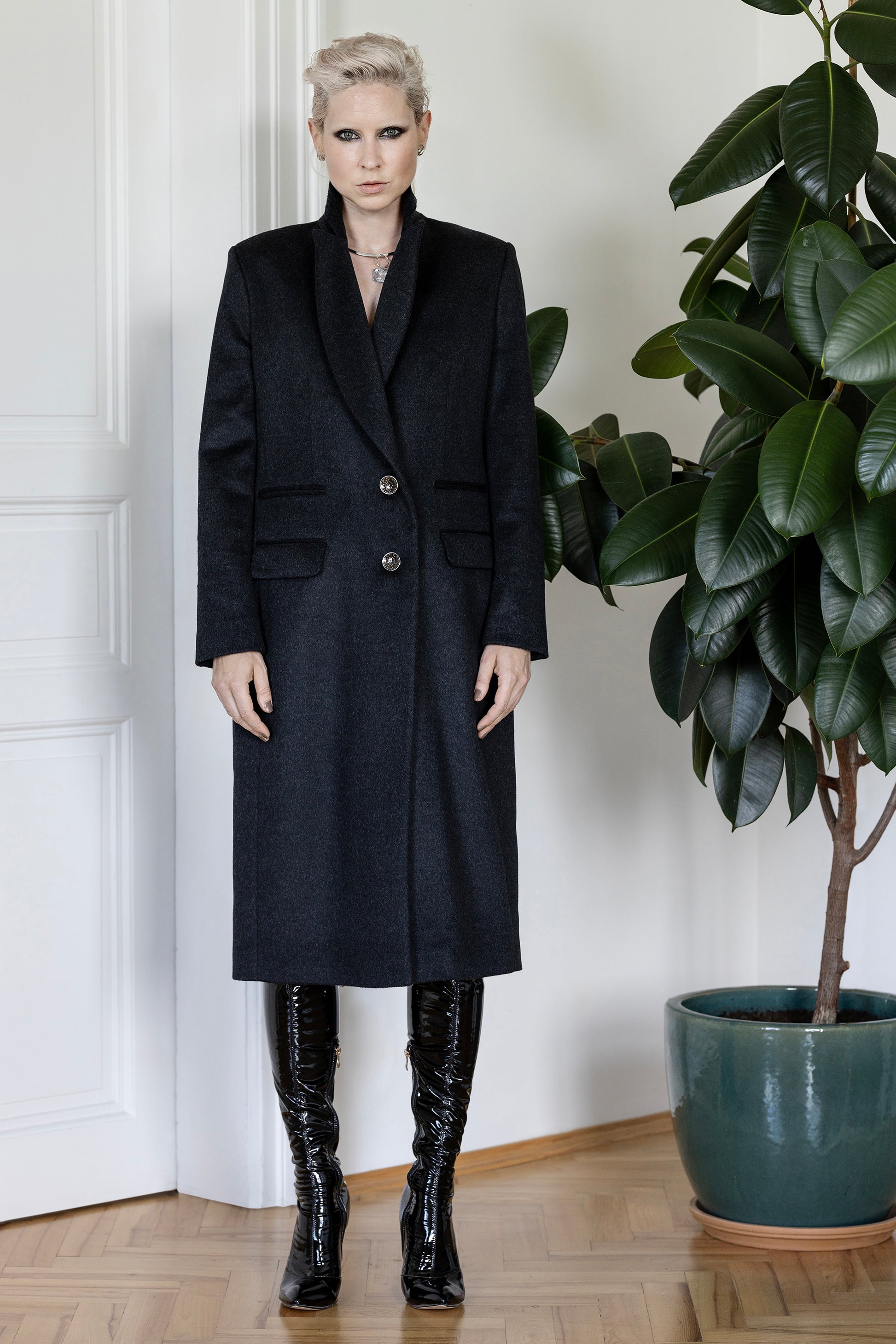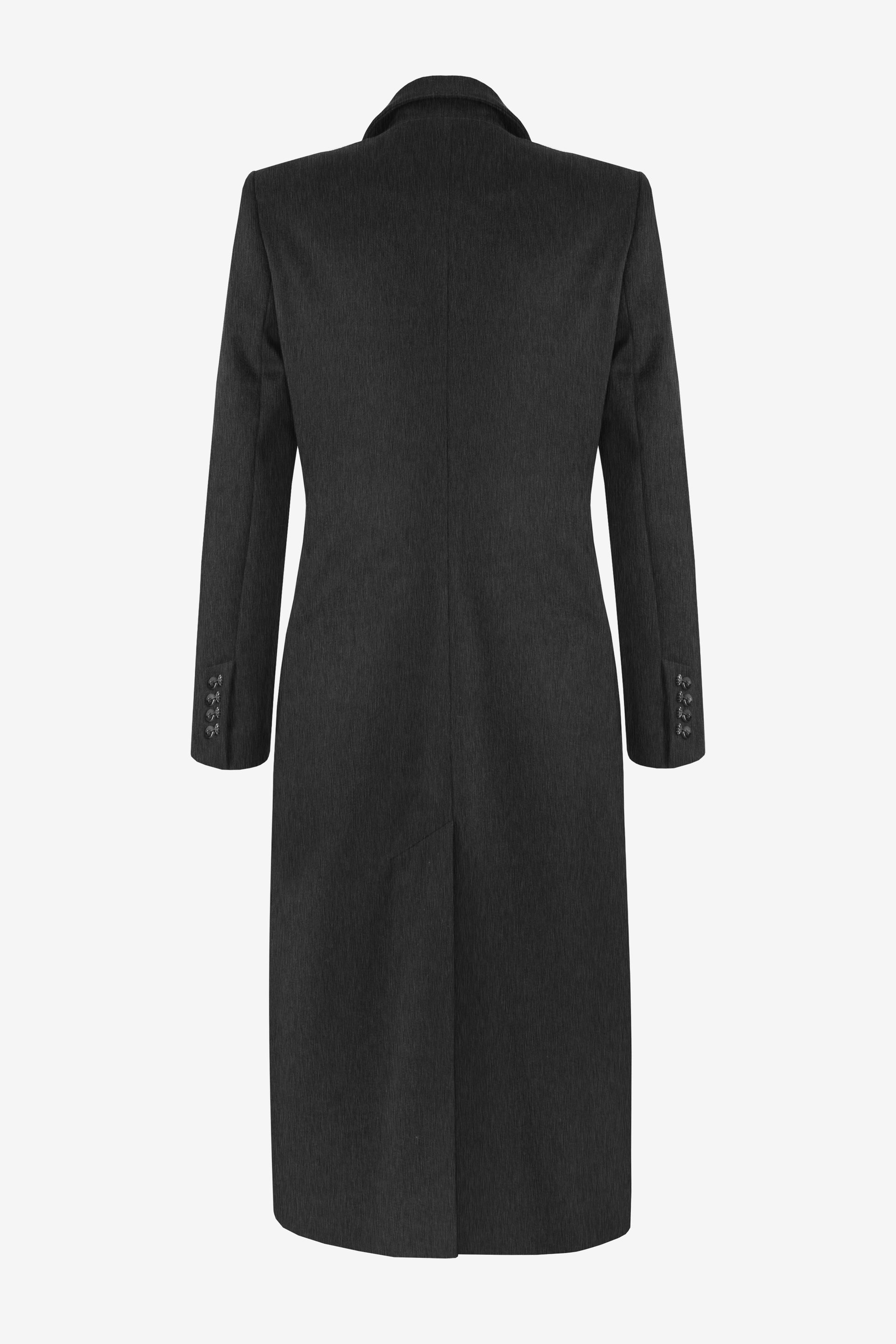 The coat is fully lined in a 100% viscose twill, sourced and woven in Europe, ensuring a refined drape and luxurious inner finish.