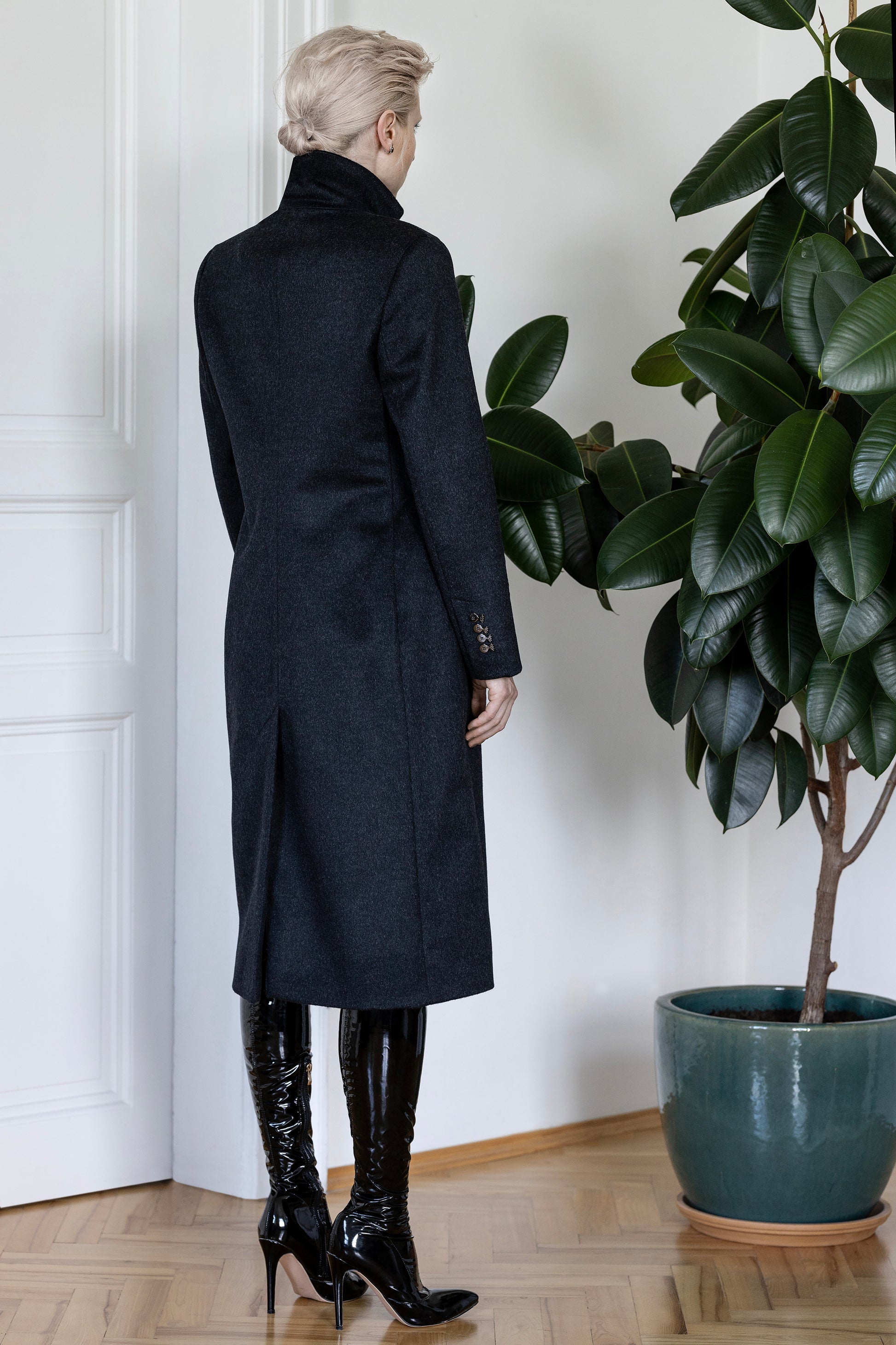 This coat is made from a luxurious blend of virgin wool and cashmere, fully lined with viscose twill. To preserve its structure and longevity, we recommend professional cleaning only.